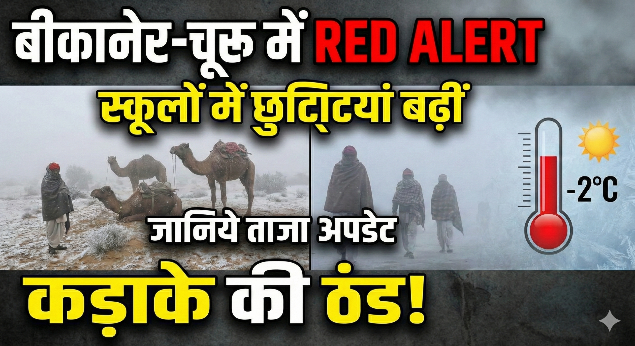 बीकानेर/चूरू | रेगिस्तानी धोरों में ऊंट उत्सव की रौनक के बीच मौसम ने तीखे तेवर दिखा दिए हैं। बीकानेर संभाग (Bikaner Division) इस समय कड़ाके की सर्दी और घने कोहरे (Dense Fog) की चपेट में है। पहाड़ियों से आ रही बर्फीली हवाओं ने बीकानेर, चूरू, हनुमानगढ़ और श्रीगंगानगर को ठिठुरा दिया है। हालात को देखते हुए मौसम विभाग (IMD) ने रेड अलर्ट जारी किया है और प्रशासन ने स्कूलों में छुट्टियां बढ़ा दी हैं ।