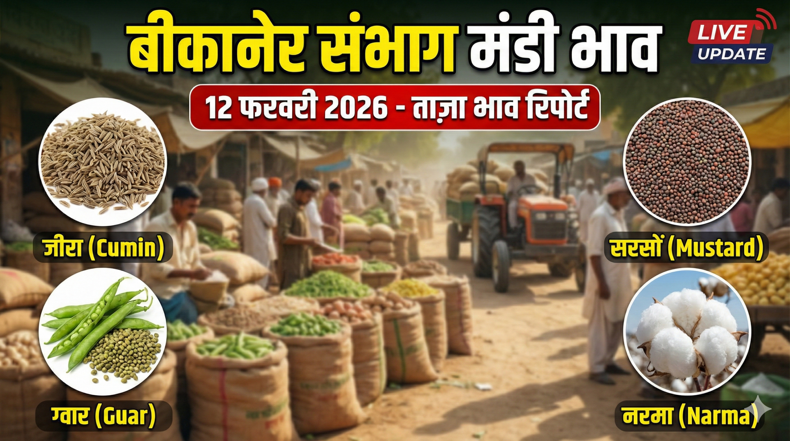 बीकानेर संभाग मंडी भाव को लेकर आज किसानों और व्यापारियों के बीच जबरदस्त हलचल देखने को मिली है। 12 फरवरी 2026 का दिन विशेष रूप से मसाला फसलों और तिलहन के लिए महत्वपूर्ण रहा। पश्चिमी राजस्थान के प्रमुख व्यापारिक केंद्रों से प्राप्त आंकड़ों के अनुसार, आज जीरा और ईसबगोल की कीमतों में उछाल आया है, जबकि नरमा (कॉटन) की कीमतों में क्वालिटी के आधार पर बड़ा अंतर देखा गया है। इस विस्तृत समाचार रिपोर्ट में, हम बीकानेर, श्रीगंगानगर, हनुमानगढ़ और अनूपगढ़ जिलों की सभी प्रमुख मंडियों का बारीकी से विश्लेषण करेंगे।