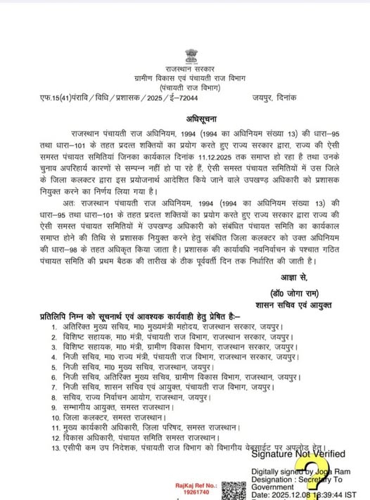 सरकार की ओर से मंगलवार को इस संबंध में औपचारिक आदेश जारी किया गया। इसके तहत संबंधित क्षेत्र के SDM को पंचायत समिति का प्रशासक बनाया जाएगा, जो समिति के दैनिक कार्यों और प्रशासनिक जिम्मेदारियों का निर्वहन करेंगे।
