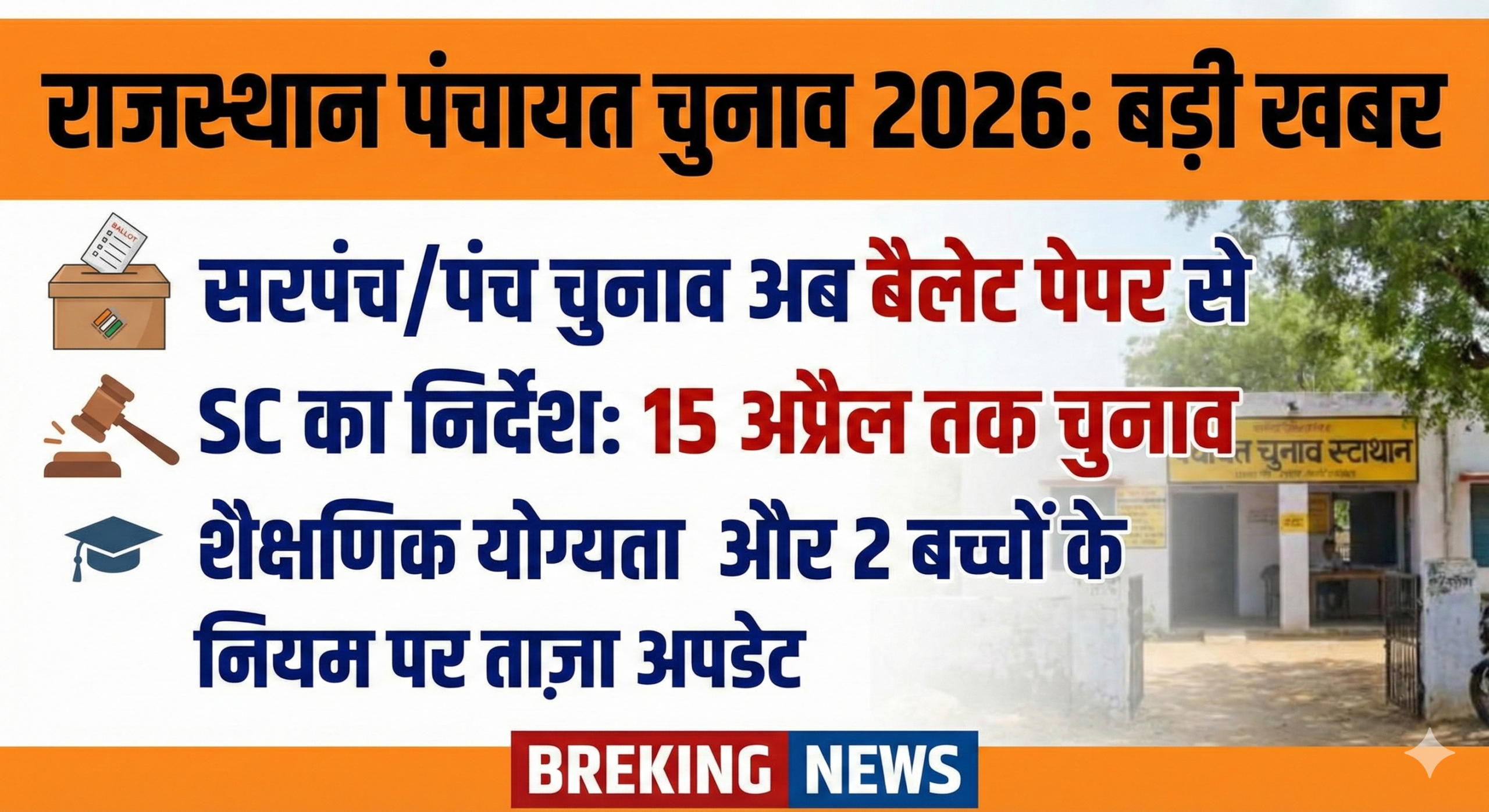 सुप्रीम कोर्ट ने चुनाव टालने की तमाम संभावनाओं पर विराम लगा दिया है। कोर्ट ने स्पष्ट आदेश दिया है कि 15 अप्रैल 2026 तक चुनाव प्रक्रिया पूरी कर ली जाए। इसका मतलब है कि मार्च-अप्रैल 2026 में राजस्थान के गांवों में सियासी पारा अपने चरम पर होगा ।
